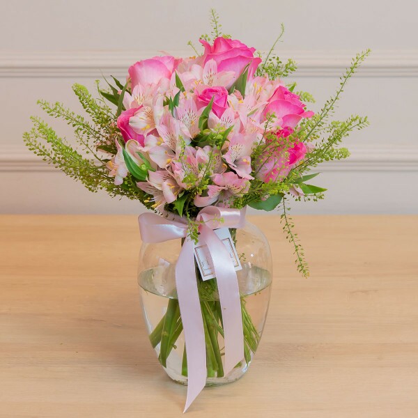 Grenoble é uma opção clássica e apaixonante, combinando rosas cor de rosa exuberantes com alstroemerias no mesmo tom, resultando em um visual sofisticado e impactante.