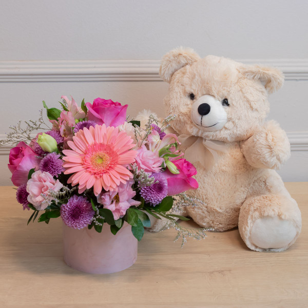 Um presente que aquece o coração e encanta pelo carinho. Este delicado arranjo de flores em tons rosados e lavanda — com rosas, margaridas, lisianthus e astromélias — é montado em um cachepô de acrílico rosado e vem acompanhado de um adorável urso de pelúcia bege, macio e aconchegante. Uma escolha perfeita para surpreender com doçura em aniversários, maternidades, Dia das Mães ou simplesmente para demonstrar afeto com um toque especial.