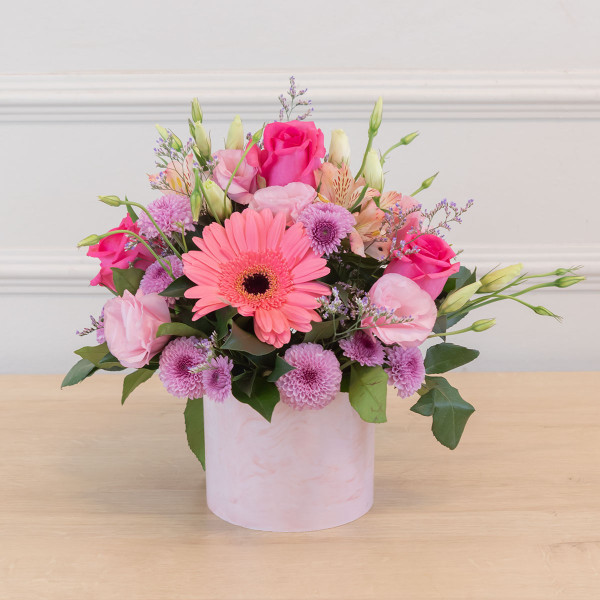Arranjo de flores confeccionada com Rosas, Margaridas e Cravos em tons rosados, envolvidas por Ruscus.