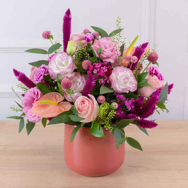Arranjo de Flores Mista em Tons Rosado no Vaso de Cerâmica Bretagne Rosa