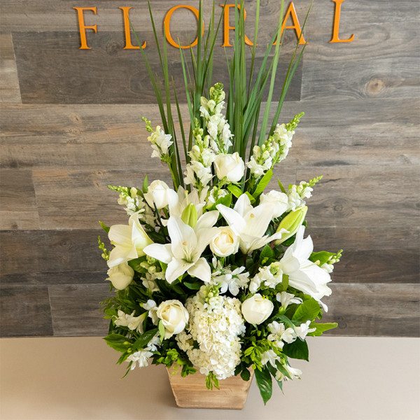 Charmoso arranjo com lírios, rosas, boca de leão branca e folhagens em um lindo cachepô de madeira.