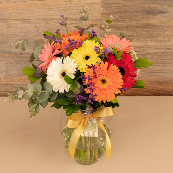 Lindo e alegre buquê composto por 12 géberas coloridas mais folhagens da estação em um lindo vaso de vidro.