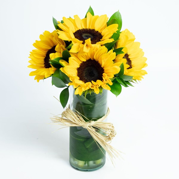 Lindo arranjo compostos por 6 girassóis e folhas de gardênia em um vaso de vidro revestido por junco.