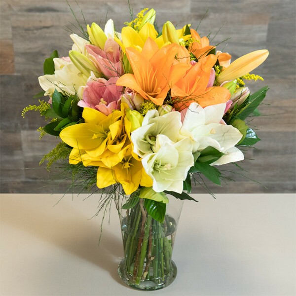 Magnífico vaso composto por 10 hastes lírios mais folhagens da estação em estilo despojado, dando leveza ao arranjo. Tudo isso em um lindo vaso de vidro.
