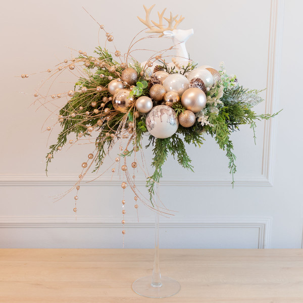 O destaque do arranjo é a charmosa rena branca com chifres em tom claro, que adiciona um toque moderno e delicado à composição. Ideal como centro de mesa para jantares especiais, recepções, aparadores ou vitrines, este arranjo traz a atmosfera natalina de forma elegante e refinada.