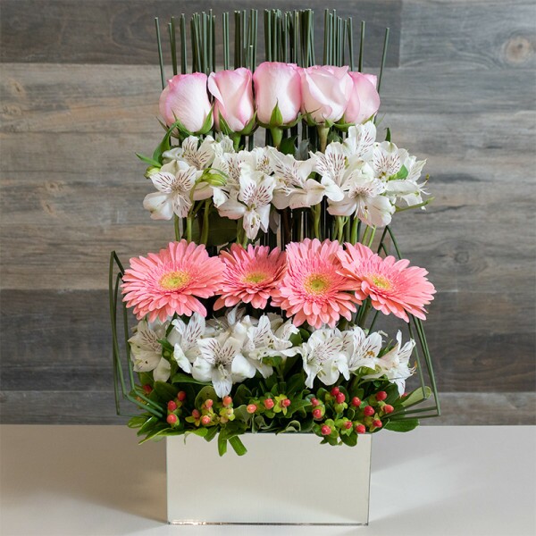 Lindo arranjo em tons rosados em jardineira espelhada. Este arranjo é composto por rosas, alstroemérias, gérberas e folhagens da estação.