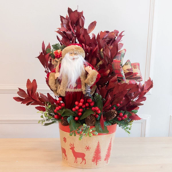 O Arranjo Natalino com Papai Noel, Folhagens Vermelhas e Berries no Cachepô Temático – 58cm é uma peça encantadora que traz o espírito natalino de forma acolhedora e sofisticada para sua decoração.