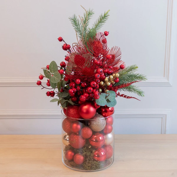 Composição cuidadosamente elaborada, unindo galhos de pinheiro, eucalipto, frutinhos vermelhos e dourados, além de bolas natalinas em tons de vermelho, dourado e champanhe, dispostas dentro de um vaso de vidro transparente, que valoriza o brilho e a profundidade da decoração.
