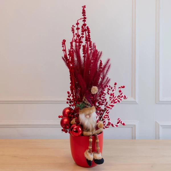Montado em um vaso vermelho brilhante, o arranjo reúne folhagens natalinas vermelhas, hastes decorativas, berries, bolas natalinas foscas e com brilho, além de um delicado boneco Papai Noel sentado, que traz um toque lúdico e festivo ao ambiente.