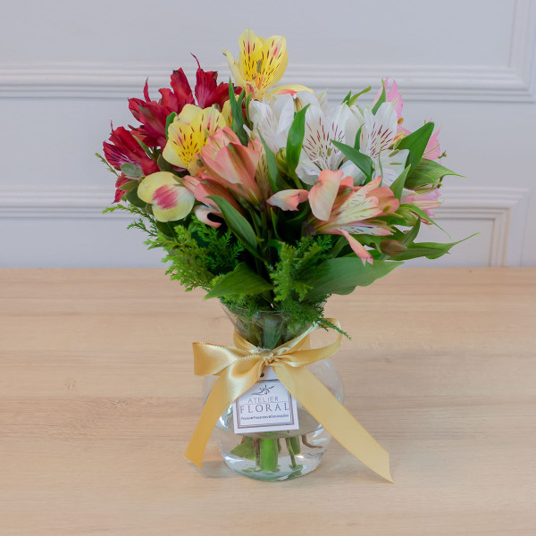 Presentei a pessoa querida com o lindo mini-buquê Singelo de Alstroemérias no Vaso. Formado por charmosas astromélias de diferentes cores depositadas em um discreto vaso de vidro, este arranjo é sinônimo de delicadeza e carinho.
