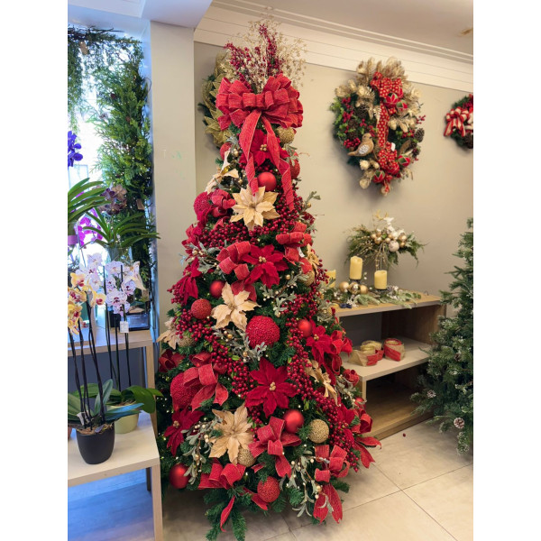 Transforme sua decoração de Natal com uma árvore exuberante e sofisticada. Com 2,1 metros de altura, esta árvore de Natal decorada combina tons clássicos de vermelho e dourado, criando um visual impactante e acolhedor.