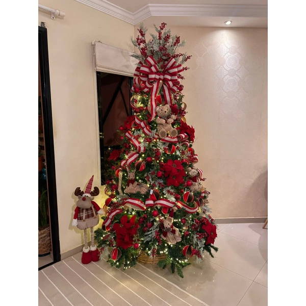 Com estrutura robusta e acabamento nevado, esta árvore é ricamente decorada com ursos e renas em tons naturais, romãs e berries vermelhas, flores natalinas, fitas listradas em vermelho e dourado e um grande laço de topo, que dá o toque final de sofisticação.