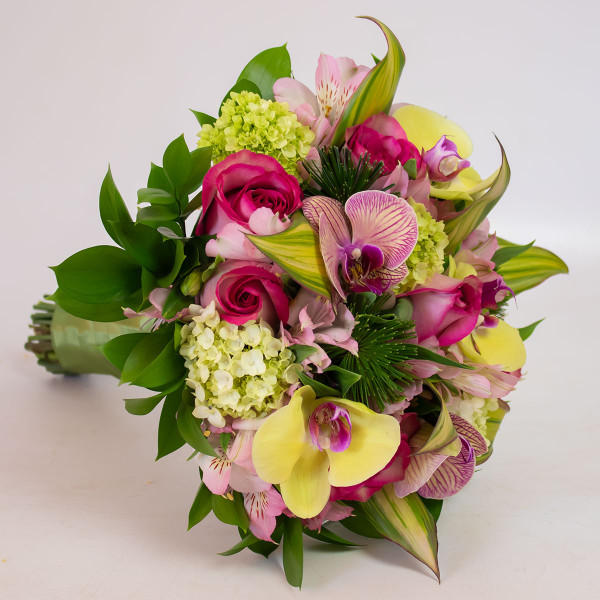 Buquê noiva composto por orquídea, rosas, alstroemérias, hortências e folhagens. O Buquê Grace é um clássico buquê redondo em tons de verde e pink.