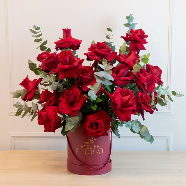 As rosas importadas se destacam por suas pétalas maiores, cor intensa e durabilidade superior, criando um arranjo impactante e sofisticado. Cada flor é posicionada manualmente para formar uma composição harmoniosa, valorizada pela elegante box floral do Atelier Floral.