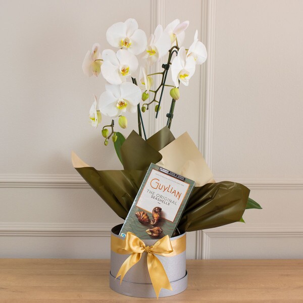 Apresentamos a "Box Luxo Orquídea e Bombons", uma fusão exuberante de sofisticação e indulgência. Esta caixa deslumbrante, adornada com um laço dourado, contém uma orquídea cascata de duas hastes na pureza do branco, adicionando um toque de elegância floral ao ambiente. Para complementar, incluímos uma caixa dos deliciosos bombons belgas Guylian Sea Shells de 125g, proporcionando uma experiência gourmet irresistível. Esta é a escolha perfeita para surpreender e encantar alguém especial, seja em celebrações ou para expressar apreço. Transforme momentos simples em lembranças preciosas com a Box Luxo Orquídea e Bombons.