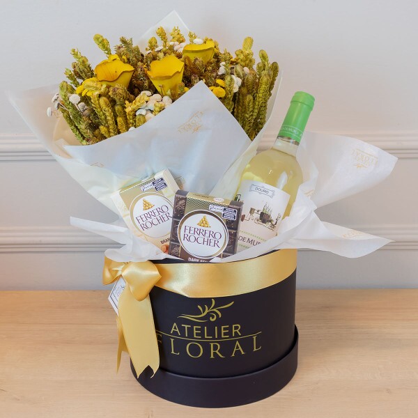A Box Presente com Flores Desidratadas, Vinho Branco e Chocolates Ferrero Rocher é ideal para surpreender em aniversários, encontros românticos ou presentes corporativos.
