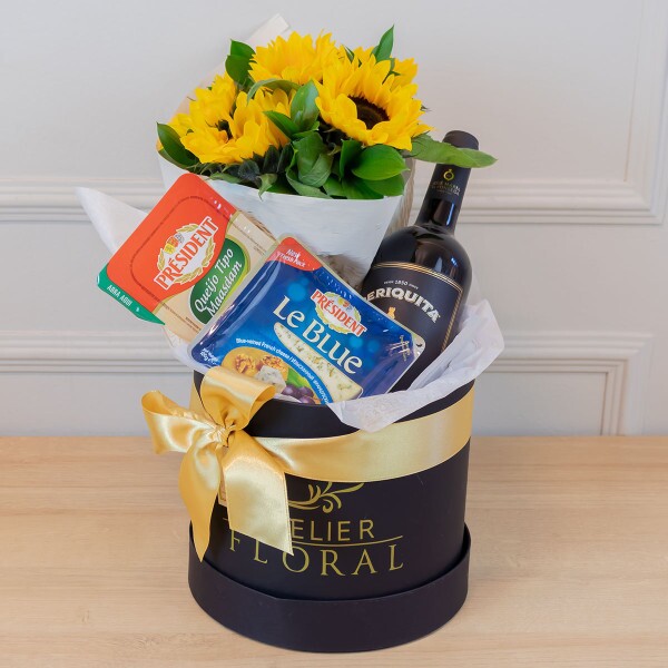 A Box Presente com Girassóis, Vinho Tinto e Queijos Especiais é ideal para comemorações, encontros românticos ou para surpreender com estilo.