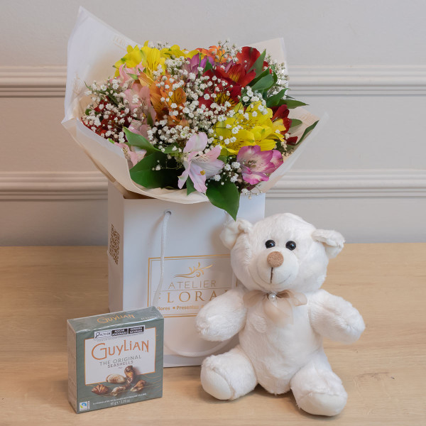 Um presente doce, delicado e cheio de afeto. O Buquê Balé de Alstroemérias Coloridas reúne flores vibrantes como amarelo, rosa, vermelho, lilás e laranja, acompanhadas de gypsophilas que trazem leveza e romantismo à composição. Acompanha um ursinho de pelúcia branco super macio e uma caixa de chocolates Guylian The Original (65g), feitos com avelãs e moldados em formato de conchinhas — perfeitos para adoçar a experiência. Tudo embalado com carinho na sacola exclusiva do Atelier Floral. Ideal para surpreender em aniversários, datas especiais, nascimentos ou apenas para dizer "estou pensando em você".