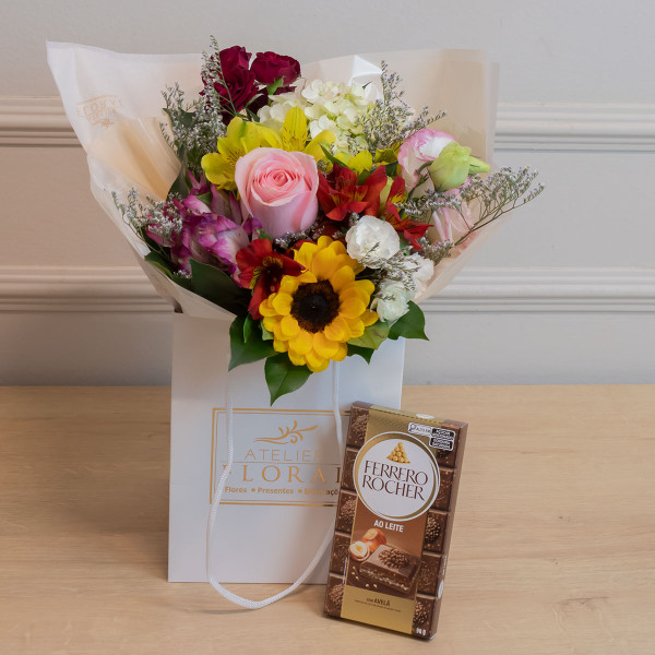 Um presente delicado e delicioso para surpreender com charme e afeto. O Buquê Balé de Flores Mistas Coloridas traz uma seleção vibrante de flores como rosas, girassol, alstroemérias, lisianthus, hortênsias e outras variedades da estação, embaladas com capricho na sacola exclusiva do Atelier Floral. Para completar o encanto, acompanha uma barra de chocolate ao leite Ferrero Rocher (90g), com pedaços crocantes de avelã e o sabor inconfundível da marca. Uma opção perfeita para celebrar com elegância e adoçar momentos especiais.