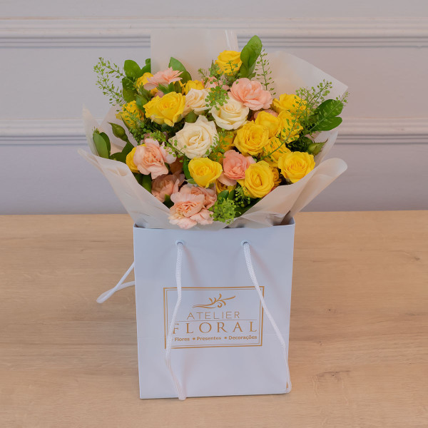 Nota de Disponibilidade: Por serem flores sazonais, as cores das mini rosas e cravíneas podem variar conforme o frescor do dia. Consulte as tonalidades disponíveis no momento do pedido.