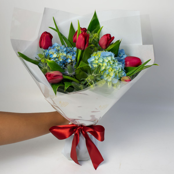O buquê Cintra é a charmosa combinação de tulipas, hortências e folhagens.