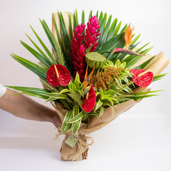 Buquê clássico tropical é chic, descolado e moderno. É composto por flores e folhagens tropicais da estação, elaborado em estilo aberto e despojado.