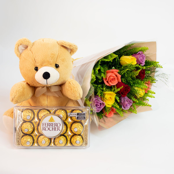 Kit composto por um lindo buquê de 12 rosas nacionais em tons intenso, um lindo urso de pelúcia e uma caixa com 12 deliciosos bombons Ferrero Rocher.