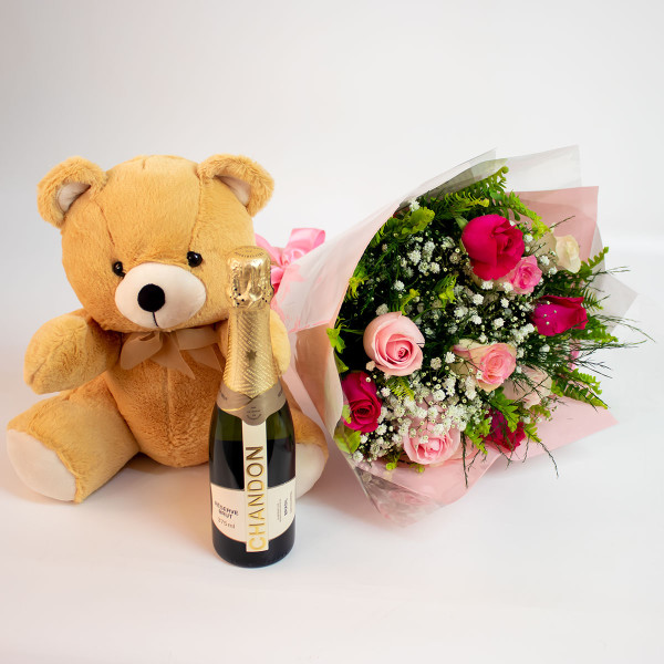 Kit composto por um lindo buquê de 12 rosas nacionais em tons rosado, um lindo urso de pelúcia e um delicioso espumante Chandon Brut de 375ml.