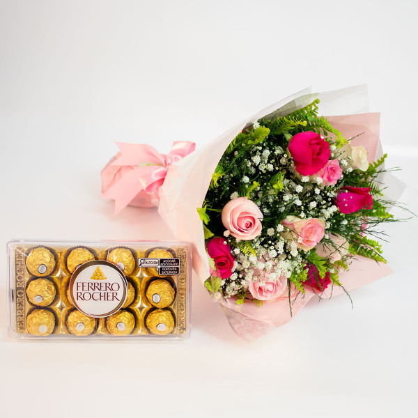 Kit composto por um lindo buquê de 12 rosas nacionais em tons rosado e uma caixa com 12 bombons Ferrero Rocher.