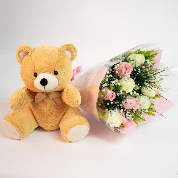 Kit composto por um lindo buquê de 12 rosas nacionais em tons rosado e um lindo urso de pelúcia.