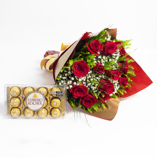 Kit composto por um lindo buquê de 12 rosas Importadas vermelhas e uma caixa dos deliciosos bombons Ferrero Rocher.
