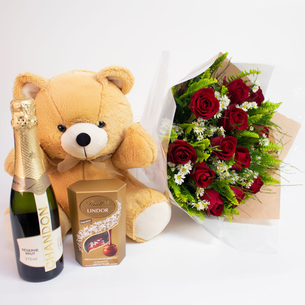Kit composto por um lindo buquê de 12 rosas nacionais vermelhas, um lindo urso de pelúcia, um deliciosos espumante Chandon Brut de 375ml e os deliciosos bombons Lindt Lindor sortido de 75g.