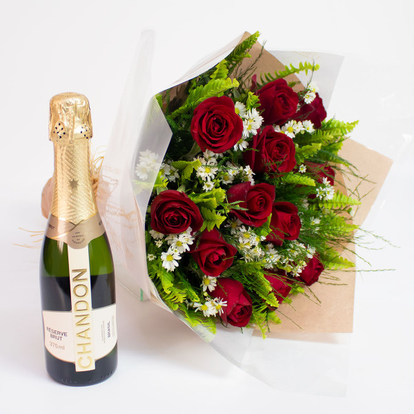 Kit composto por um lindo buquê de 12 rosas nacionais vermelhas e um delicioso espumante Chandon Brut de 375ml