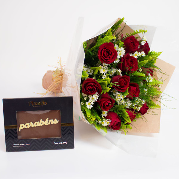 Kit composto por um lindo buquê de 12 rosas nacionais vermelhas e uma deliciosa placa de chocolate escrito parabéns da Planalto.