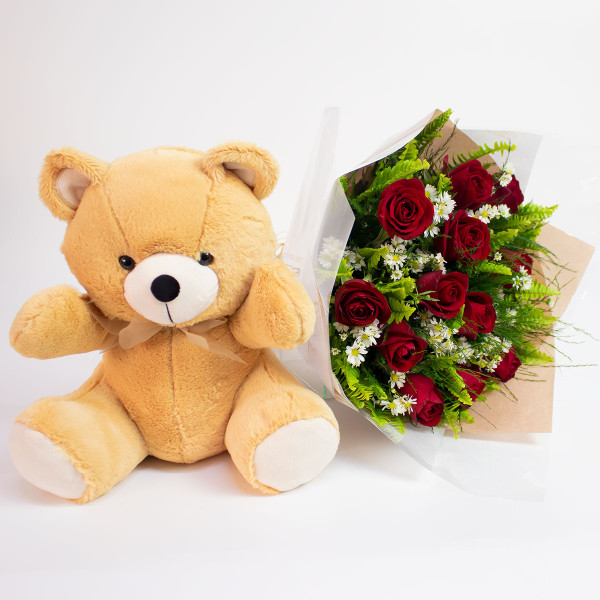 Kit composto por um lindo buquê de 12 rosas nacionais vermelhas e um lindo urso de pelúcia.