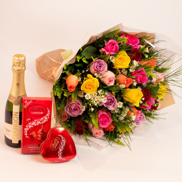 Kit composto por um lindo buquê de 30 rosas coloridas, um espumante Chandon Brut de 375ml e dois delicioso chocolates Lindor Lint ao leite de.