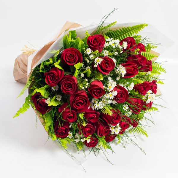 Lindo e tradicional buquê composto por rosas nacionais e folhagens da estação embalado no papel com laço de ráfia. Buquê disponível em diversas cores (amarelo, branco, champanhe, cor de rosa, laranja, lilás, colorido, vermelho,...).