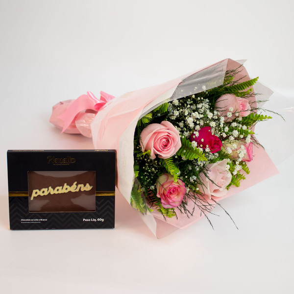 Kit composto por um lindo buquê de 6 rosas nacionais em tons rosado e uma deliciosa placa de chocolate escrito parabéns da Planalto.