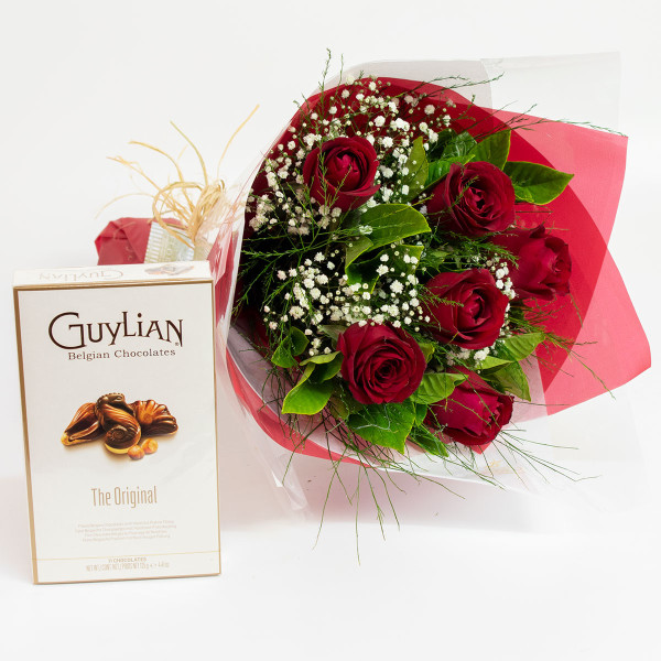 Lindo e tradicional buquê composto por 6 rosas nacionais e folhagens da estação embalado no papel com laço de ráfia acompanhado pelos deliciosos bombons de chocolate belga da Guylian 125g.