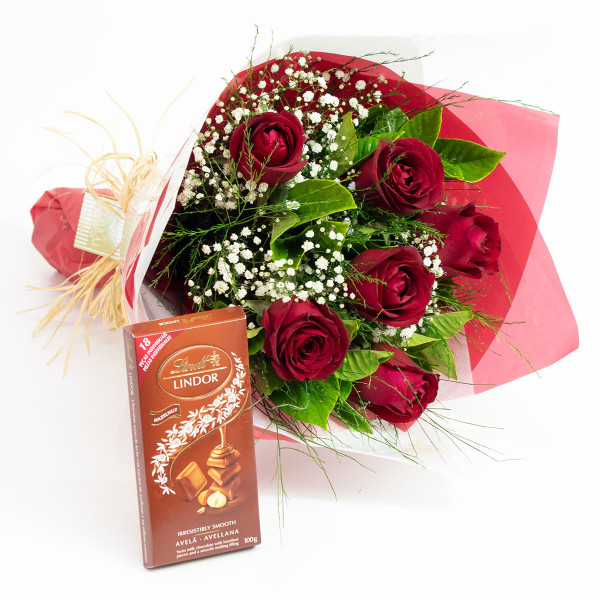 Lindo e tradicional buquê composto por 6 rosas nacionais e folhagens da estação embalado no papel com laço de ráfia acompanhado pelo delicioso chocolate Lindt Lindor de avelã 100g.