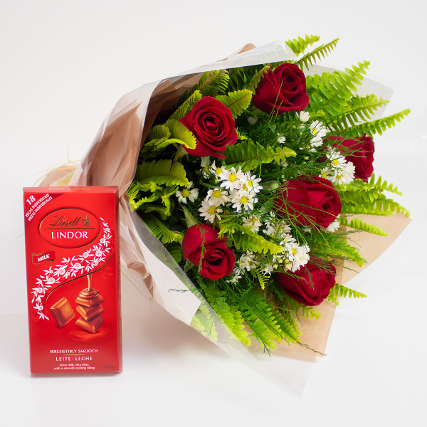 Kit composto por um lindo buquê de 6 rosas nacionais vermelhas e um delicioso chocolate Lindt Lindor ao leite de 100g.