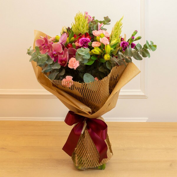 Surpreenda alguém especial com o nosso Buquê de Flores Coloridas com Orquídeas e Alstroemérias Jolie, uma combinação vibrante de flores frescas que trazem elegância e alegria para qualquer ocasião. Este buquê encantador inclui orquídeas em tons rosados, cravíneas delicadas, alstroemérias amarelas e uma seleção de folhagens verdes, criando um arranjo harmonioso e sofisticado.