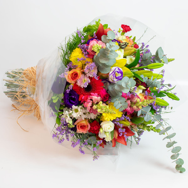 Charmosa composição de flores variadas coloridas (rosas, boca de leão, cravos, hortências, lisianthus, lirio, margaridas, ...) em meio a folhagens da estação e embalado no papel celofane com laço de cetim. Um encanto de buquê!