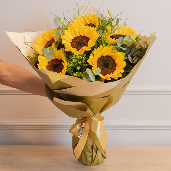Traga a energia do sol para qualquer ocasião com este buquê clássico de 6 girassóis, combinados com folhagens frescas da estação. O estilo despojado do arranjo proporciona leveza e um toque natural, perfeito para transmitir alegria e positividade.