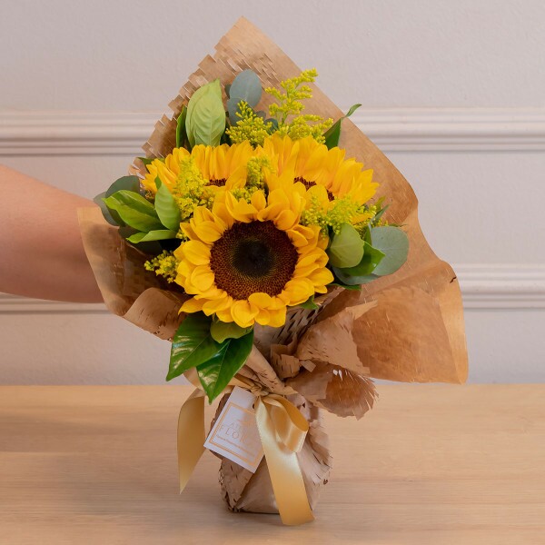 Encante com a simplicidade e a beleza vibrante do nosso buquê de 3 girassóis. Com flores radiantes e folhagens frescas.