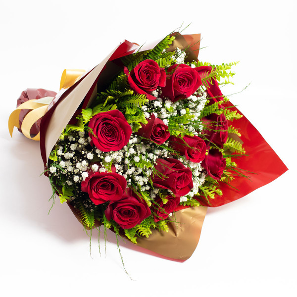 Lindo e tradicional buquê composto por 12 rosas Importadas, áster e folhagens embalado no celofane e seda com laço de ráfia.
