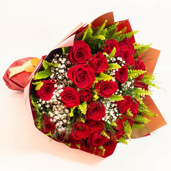 Lindo e tradicional buquê composto por 36 rosas Importadas, áster e folhagens embalado no celofane e seda com laço de ráfia.