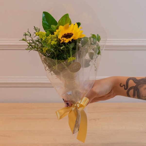 Um gesto simples que transmite muita luz e carinho! O Buquê Delicado de Girassol é composto por um girassol vibrante, harmonizado com folhagens frescas que destacam a beleza natural da flor.