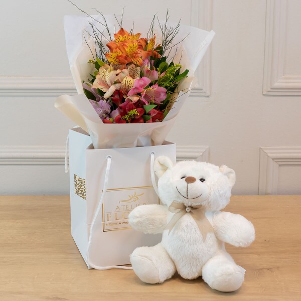 Um presente cheio de ternura para encantar em qualquer ocasião. Este buquê delicado é composto por alstroemérias coloridas cuidadosamente acomodadas em embalagem especial, dentro da charmosa sacola Atelier Floral. Para completar o carinho, acompanha um urso de pelúcia macio e aconchegante, tornando o gesto ainda mais afetivo. Ideal para aniversários, agradecimentos, demonstrações de amor ou apenas para arrancar sorrisos.