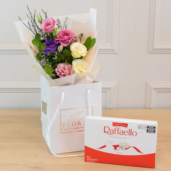 Um presente que combina elegância e sabor! Este buquê delicado de lisianthus em tons suaves de rosa, lilás, amarelo e branco vem acompanhado de uma deliciosa caixa de chocolates Raffaello. A composição vem na charmosa sacola presenteável do Atelier Floral, perfeita para surpreender com carinho e sofisticação.